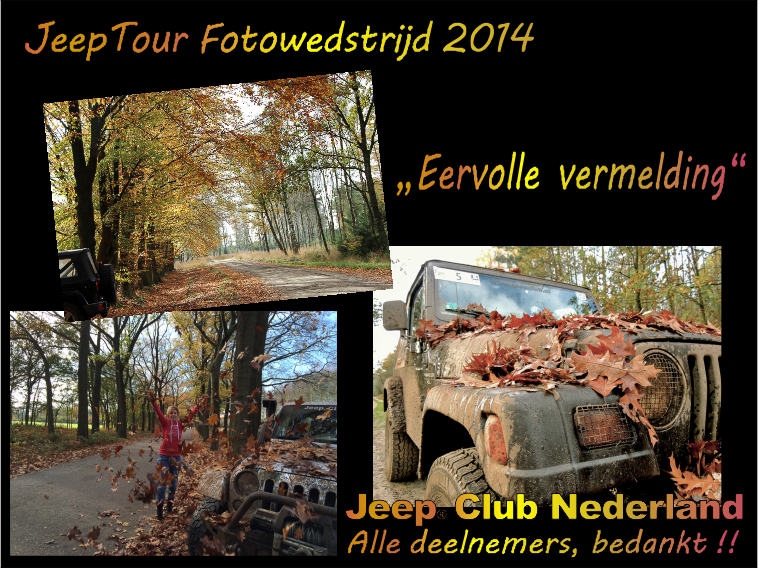 Roo4JK Posted December 2, 2014 Report Posted December 2, 2014 Bij deze de uitslag v/d JeepTour Fotowedstrijd van 9 november 2014 !! Na zwaar overleg........ waar gelet werd op o.a. : Creativiteit, kleur, belichting, scherpte en het thema. Is de uitslag: (zie afbeeldingen) Willen via deze weg alle deelnemers bedanken voor hun creatieve inzendingen. En in het bijzonder: Ang 1 Quote